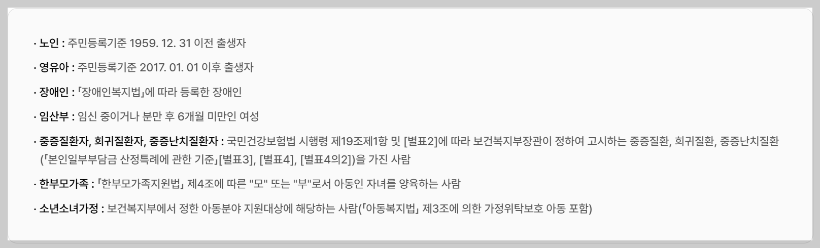 - 세대원 특성기준 : 주민등록표 등본상 '기초생활수급자(본인) 또는 세대원이 노인, 영유아, 장애인, 임산부, 중증질환자, 희귀 질환자, 중증난치질환자, 한부모가족, 소년소녀가정 등에 해당되어야 합니다.