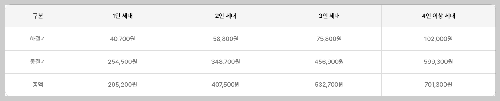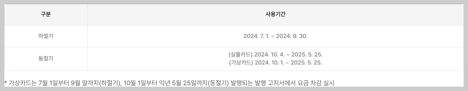 사용방법은 하절기는'요금차감'만 선택할 수 있으며, 동절기에는 '요금차감'과 '국민행복카드' 중 한 가지를 선택하여 신청할 수 있습니다.