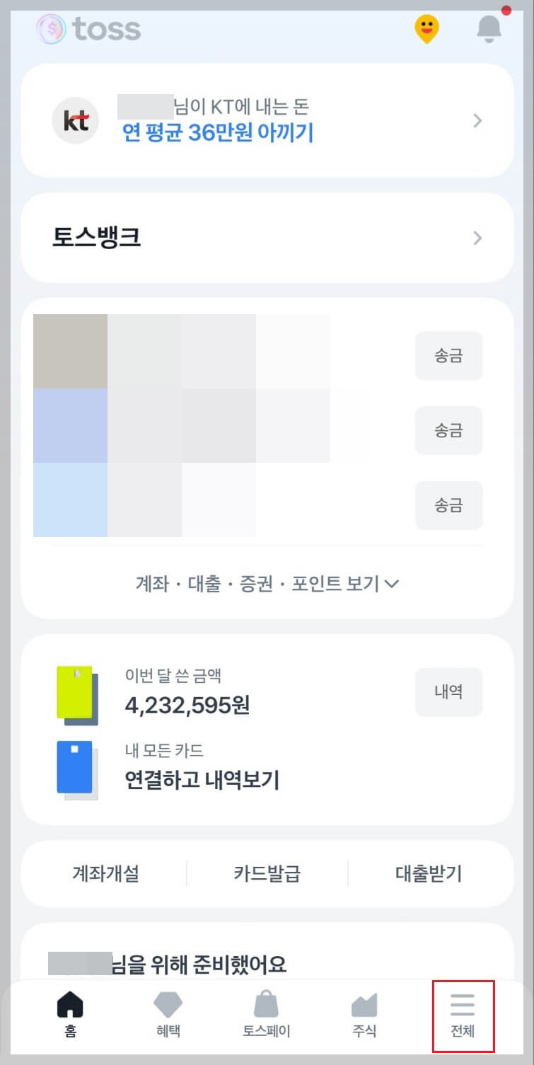 1) 토스앱 접속> 오른쪽 하단 '전체' 클릭