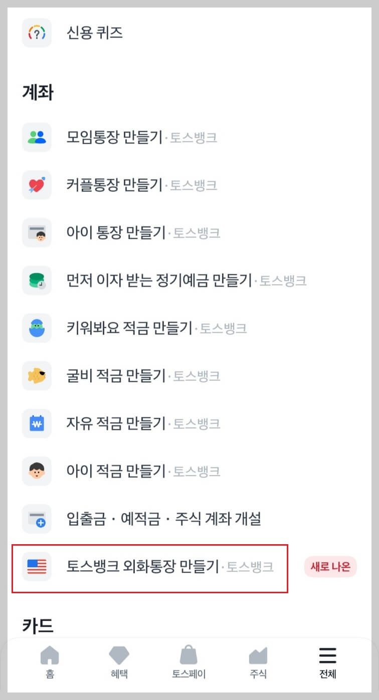 2) 쭉 내리다 보면 '계좌' 메뉴에서 '토스뱅크 외화통장 만들기' 클릭