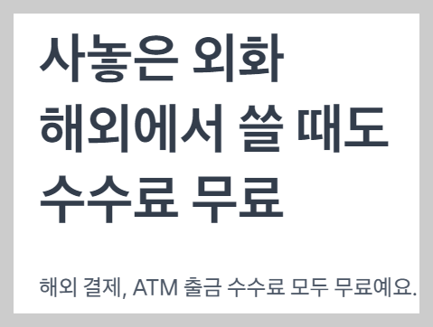 - 해외 ATM출금 이용시 : 국제브랜드 수수료(1%) 및 건당 3 USD 면제(단, 해외 ATM출금 이용 시 별도 현지 수수료 부과 될 수 있음)