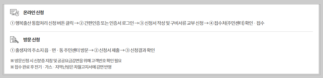 - 방문신청 : 출생자의 주소지 읍, 면, 동 주민센터 방문 > 신청서 제출> 신청결과 확인(신분증 및 공공요금 감면을 위한 고객번호 확인필요)